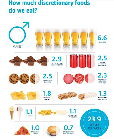 As can be seen from the infographic, discretionary foods includes alcohol, soft drinks, cakes, biscuits, chips, icecream, chocolate, muesli and snack bars, and other take away foods.